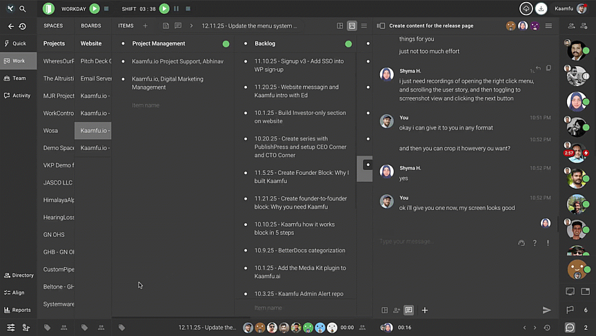 Kaamfu brings work management, contextual chat, time tracking, and desktop activity together in one place. Instead of moving across different tools for updates, communication, and tracking, teams can collaborate and stay aligned inside a single environment.