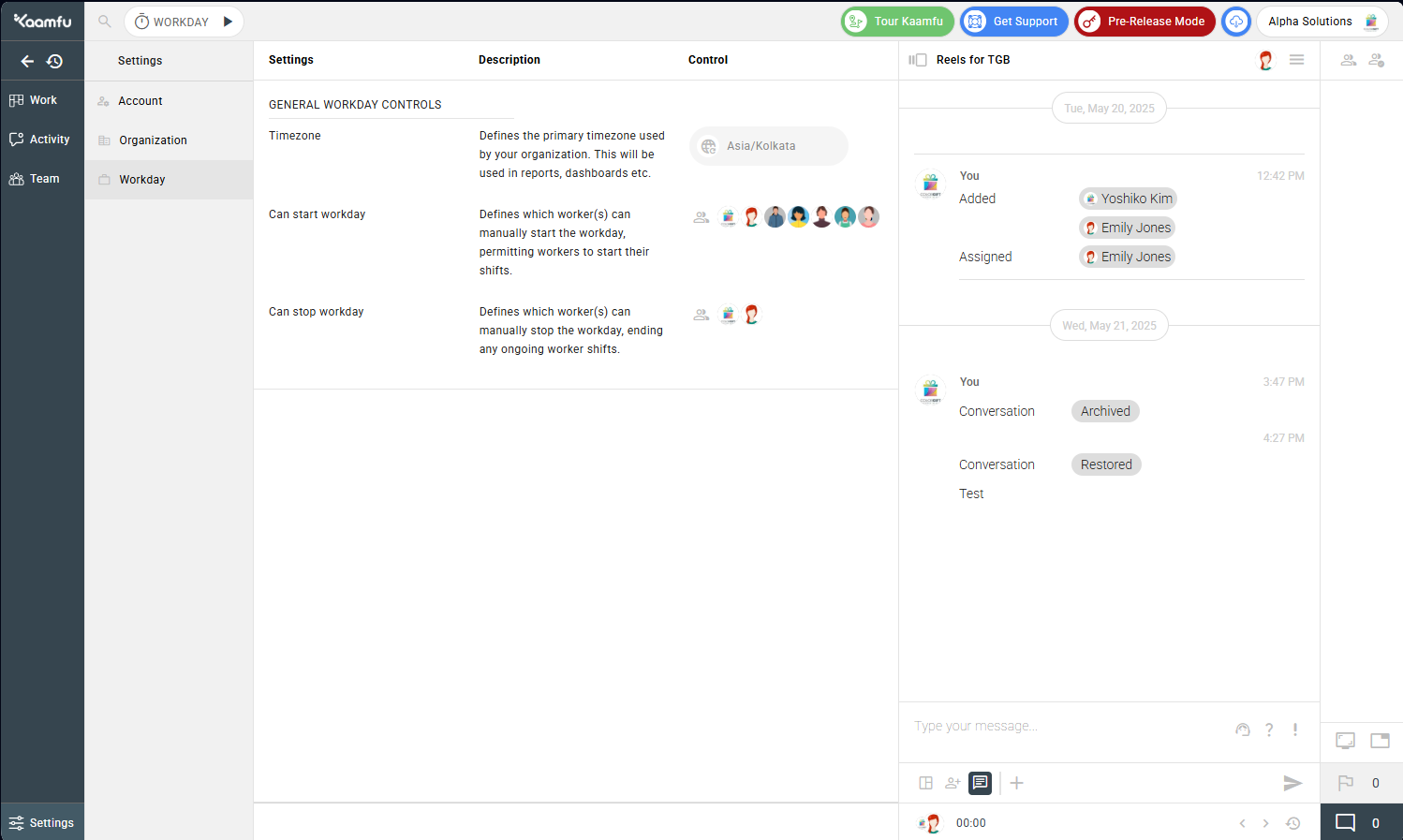 Right-clicking a member’s avatar now opens an extended pane that defaults to Story view. This is a live, AI-generated narrative of the member’s last hour of work. Alongside the story, Kaamfu shows an alignment score calculated from multiple activity and work signals, helping you quickly understand how a worker’s activity aligns with expectations.