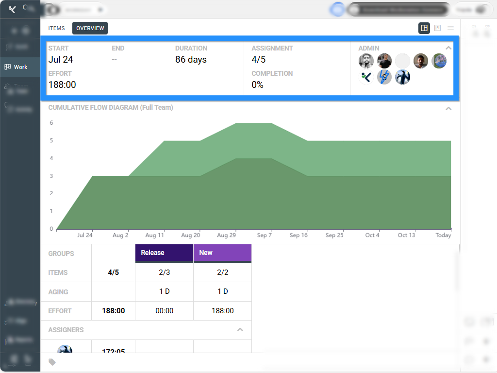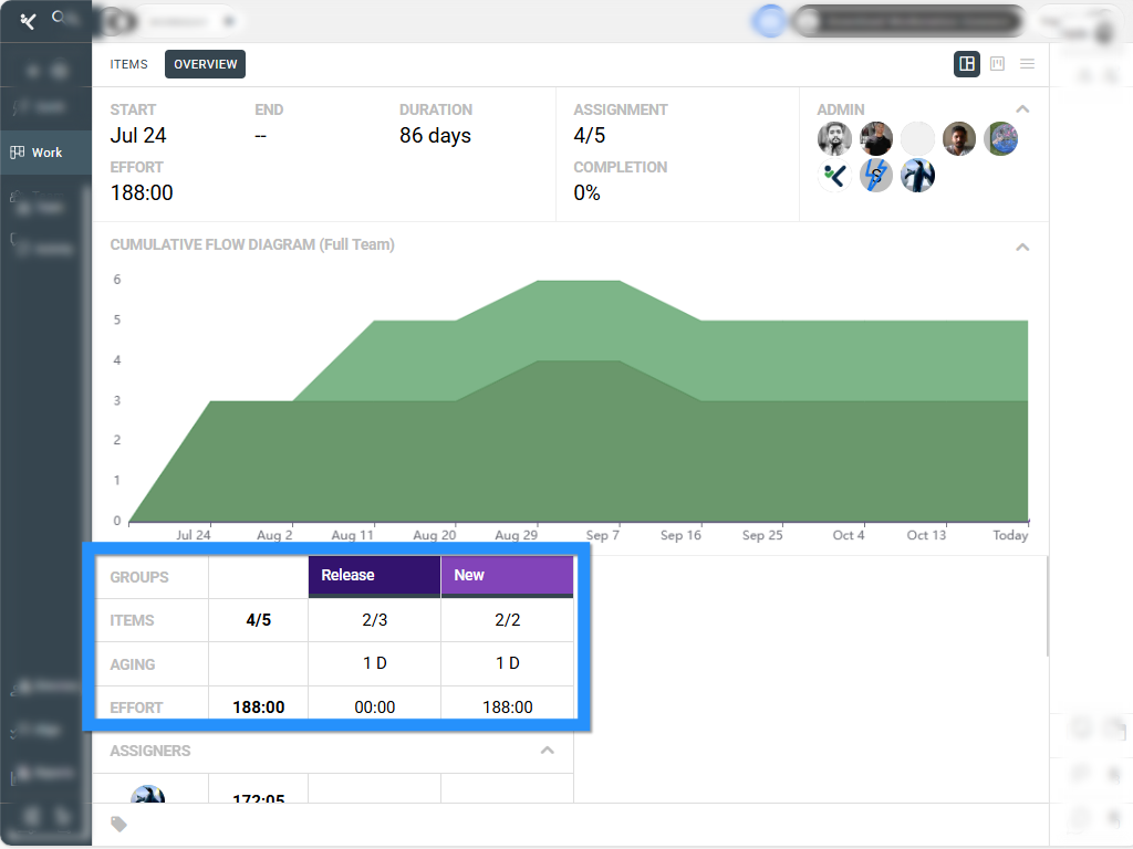 This table shows key metrics for each Item Group, including number of items, task aging, and effort. It gives a quick snapshot of workload and progress per group.